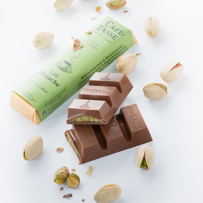 Ein Riegel aus zartschmelzender Vollmilchschokolade (38 %) gefüllt mit einer cremigen Pistazienfüllung. Ein köstlicher Snack für zwischendurch, ideal verpackt im Verkaufsdisplay.