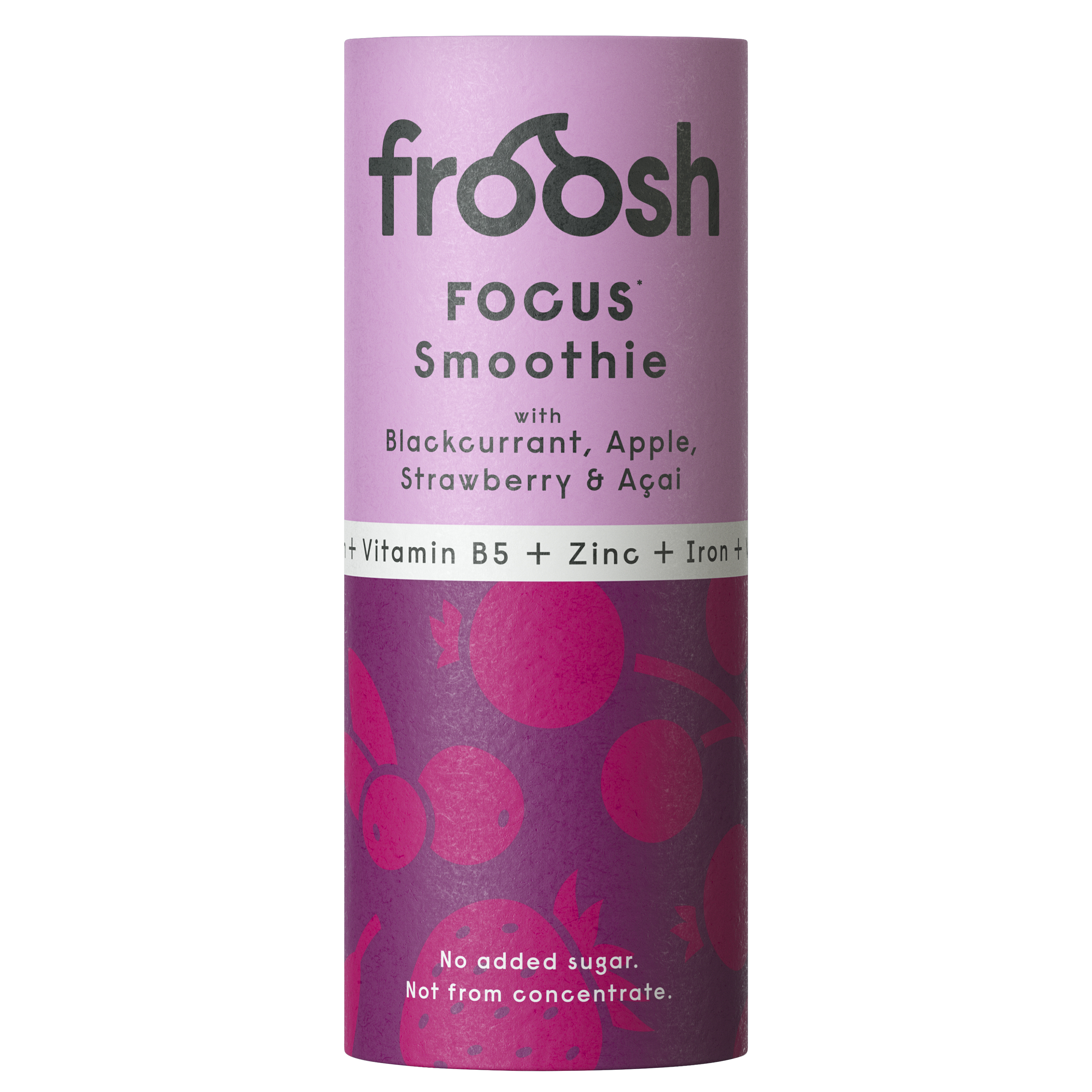 Der Focus Smoothie kombiniert die fruchtigen Aromen von schwarzer Johannisbeere, Erdbeere und Acai zu einem intensiven, beerigen Geschmackserlebnis. Angereichert mit den Vitaminen B1, B5, C und E.