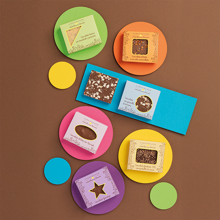 Das Display der „Cioccolato 40g“-Linie vereint sechs verführerische Sorten – darunter Milchschokolade mit Haselnüssen, karamellisierten Haselnüssen oder Nougatkörnern, Gianduja, weiße Schokolade mit Mandeln und Pistazien sowie Zartbitterschokolade mit 70 % Kakao und Kakaosplitter – und ermöglicht so eine abwechslungsreiche Verkostungstour für alle, die sich nicht für nur eine Sorte entscheiden möchten.