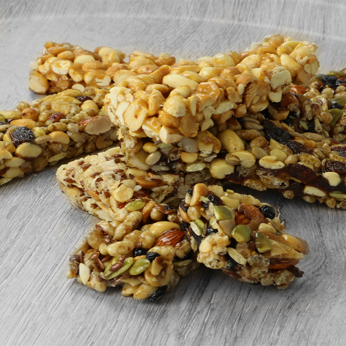 Rosinen* (20%) (Rosinen*, Sonnenblumenöl*), ERDNÜSSE* (19%), Sonnenblumenkerne*, Agavensirup*, CASHEWNÜSSE* (8%), Goji-Beeren* (6%), Leinsamen*, brauner Reissirup*, MANDELN* (5%), Kürbiskerne*, Sonnenblumenölmischung* (Sonnenblumenöl*, Antioxidationsmittel: tocopherolhaltiger Extrakt, Rosmarinextrakt*), Granatapfelsaftkonzentrat*, Himbeeren (1%)*, Geliermittel: Agar-Agar (E 406). *Aus kontrolliert biologischem Anbau.