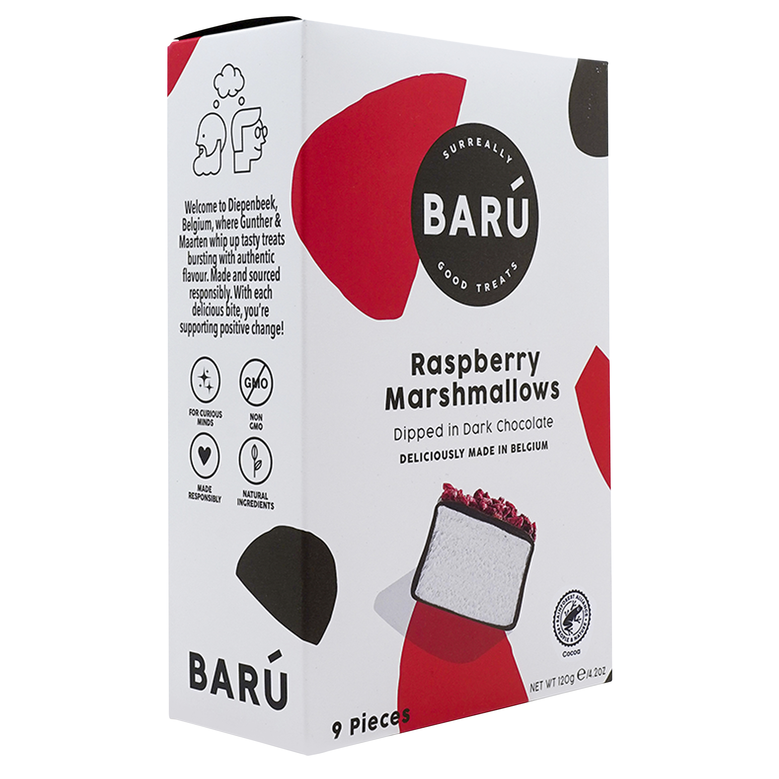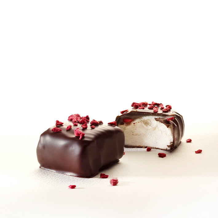 Der Geschmack der Himbeeren harmoniert perfekt mit der feinen Vanillenote des Marshmallows und dem knackigen Überzug aus dunkler Schokolade (45 %). Diese süße Kreation ist eine köstliche Ergänzung zu Desserts oder als eigenständiger Snack. Der Mix aus fruchtiger Himbeere, cremigem Marshmallow und zartbitterer Schokolade bietet ein unvergleichliches Geschmackserlebnis.