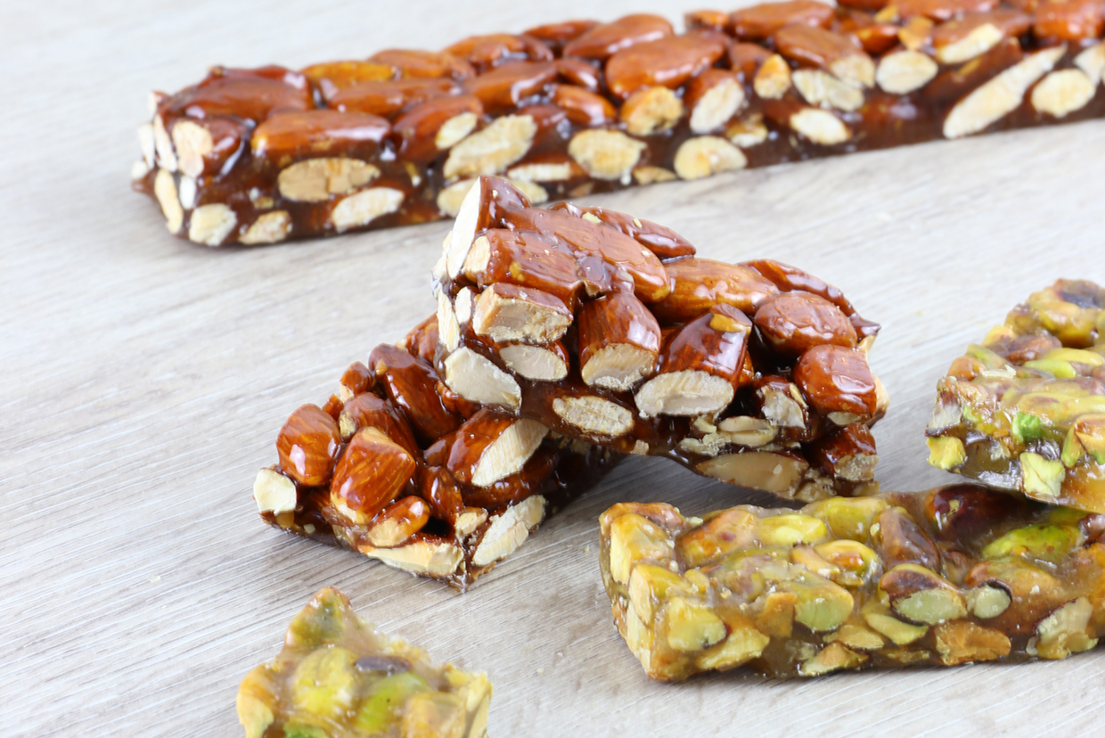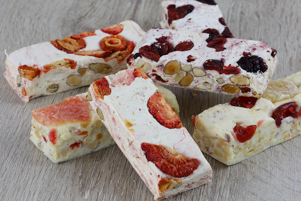 Weicher Nougat mit Haselnüssen (27 %) und Zartbitterschokolade (5 %): Zucker, HASELNÜSSE, Glukosesirup, Honig, Maisstärke, Kakaopulver, Kakaomasse, ERDNUSSÖL, EIKLAR*, Kartoffelstärke, Kakaobutter, Wasser, natürliche Aromen, Emulgator: SOJALECITHINE. *von Eiern aus Bodenhaltung.; Weicher Nougat mit weißer Schokolade (13 %): Zucker, Glukosesirup, Honig, MANDELN, HASELNÜSSE, Maisstärke, Kakaobutter, MAGERMILCHPULVER, Sonnenblumenöl, LAKTOSE, VOLLMILCHPULVER, MOLKENPULVER, Kokosnussöl, EIKLAR*, Kartoffelstärke, natürliche Aromen, Wasser, Emulgator: Lecithine (SOJA, Sonnenblume). *von Eiern aus Bodenhaltung. ; Weicher Nougat mit dunkler Schokolade (25 %): Zucker, Kakaomasse, Glukosesirup, Honig, MANDELN, HASELNÜSSE, Maisstärke, Kakaobohnenstückchen, Kakaobutter, EIKLAR*, Kartoffelstärke, natürliche Aromen, Emulgator: SOJALECITHINE, Wasser. *von Eiern aus Bodenhaltung.