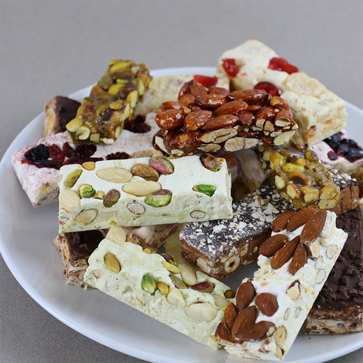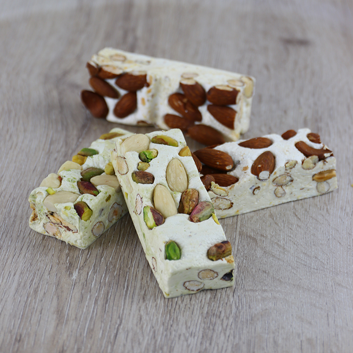 Weicher Nougat mit Mandeln (26 %): Zucker, MANDELN, Glukosesirup, Honig, Maisstärke, EIKLAR*, Kartoffelstärke, natürliche Aromen. *von Eiern aus Bodenhaltung.; Weicher Nougat mit Haselnüssen (26 %): Zucker, HASELNÜSSE, Glukosesirup, Honig, Maisstärke, EIKLAR*, Kartoffelstärke, natürliche Aromen. *von Eiern aus Bodenhaltung.; Weicher Nougat mit Pistazienzubereitung (11 %) und Pistazien (8,5 %): Zucker, MANDELN, Glukosesirup, Honig, PISTAZIEN, HASELNÜSSE, Maisstärke, Sonnenblumenöl, MAGERMILCHPULVER, EIKLAR*, Kartoffelstärke, MOLKENPULVER, LAKTOSE, Kakaobutter, Salz, Konzentraten (Kürbis, Spirulina, Apfel), natürliche Aromen, Emulgator: Lecithine (Sonnenblume). *Von Eiern aus Bodenhaltung