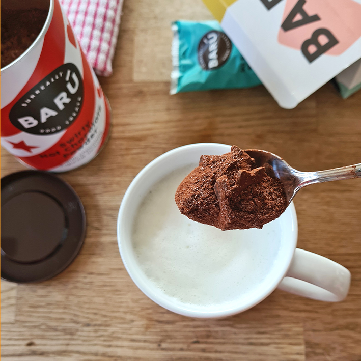 Ein Trinkschokoladenpulver mit mindestens 30 % Kakao, angereichert mit kleinen Schokoladenfiguren aus belgischer Schokolade. Diese Mischung sorgt für eine besonders schokoladige und verspielte heiße Schokolade.