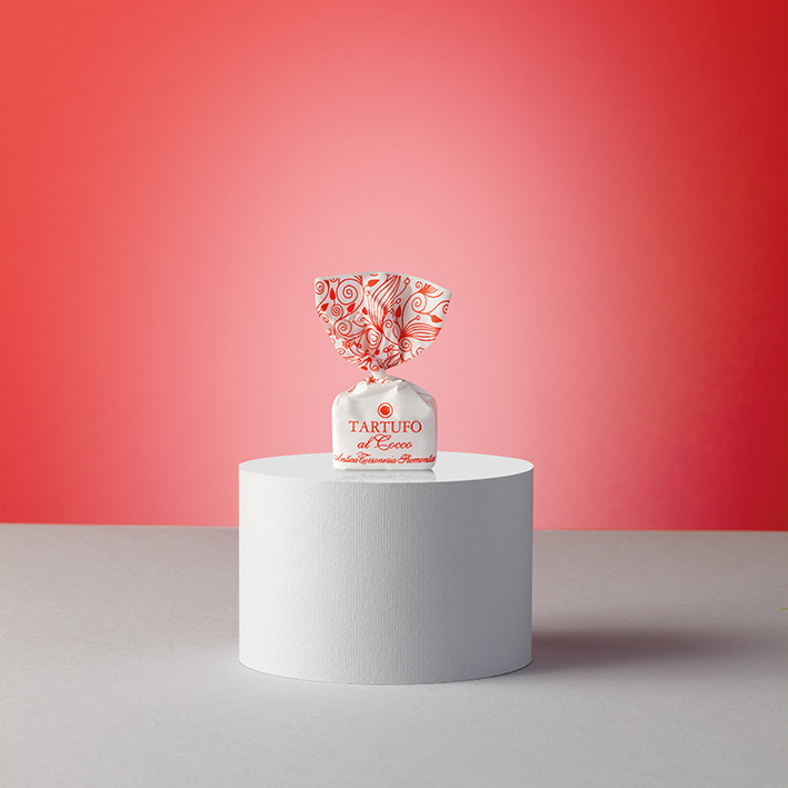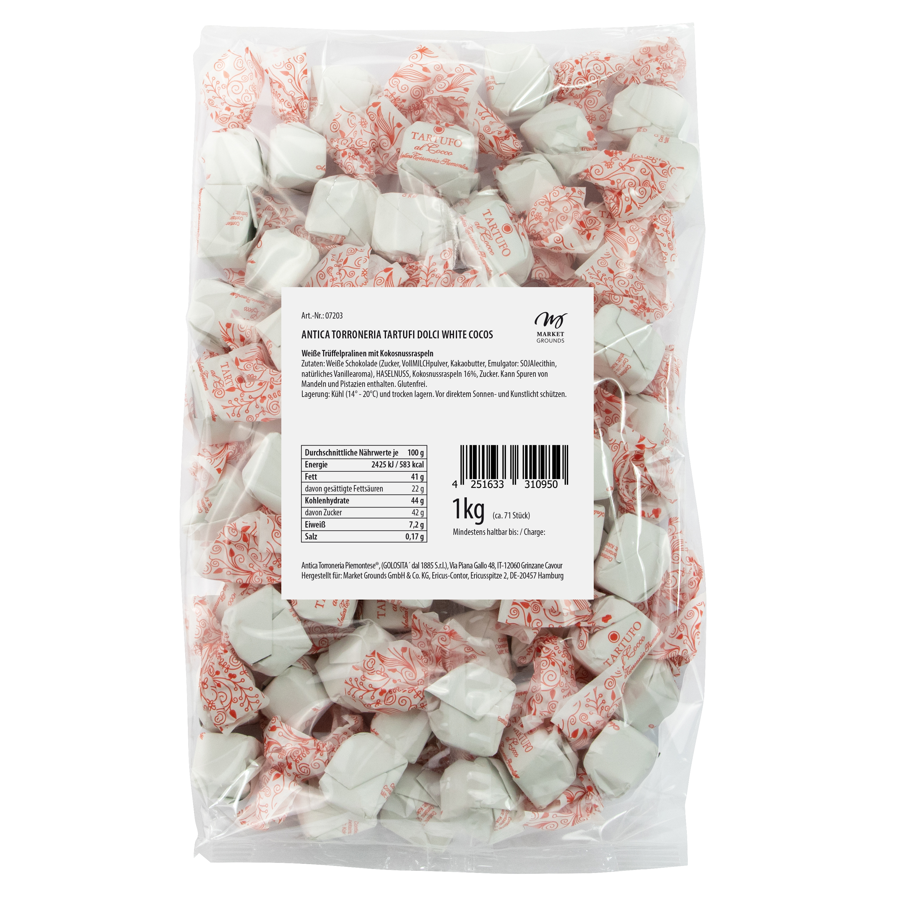 Eine exquisite weiße Trüffelpraline, verfeinert mit gerösteten Haselnüssen und Kokosraspeln. Die cremige Textur und die süßen, knusprigen Kokosraspeln verleihen dieser Praline ein unvergleichliches Geschmackserlebnis, das Ihre Sinne verführt.