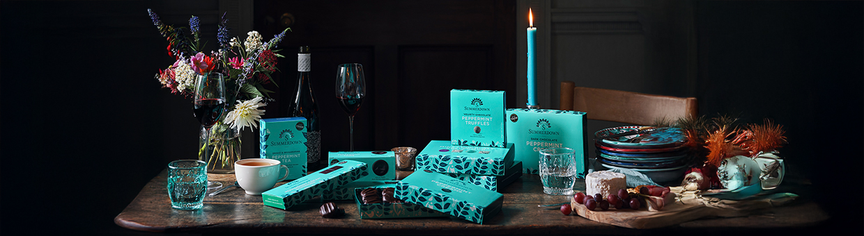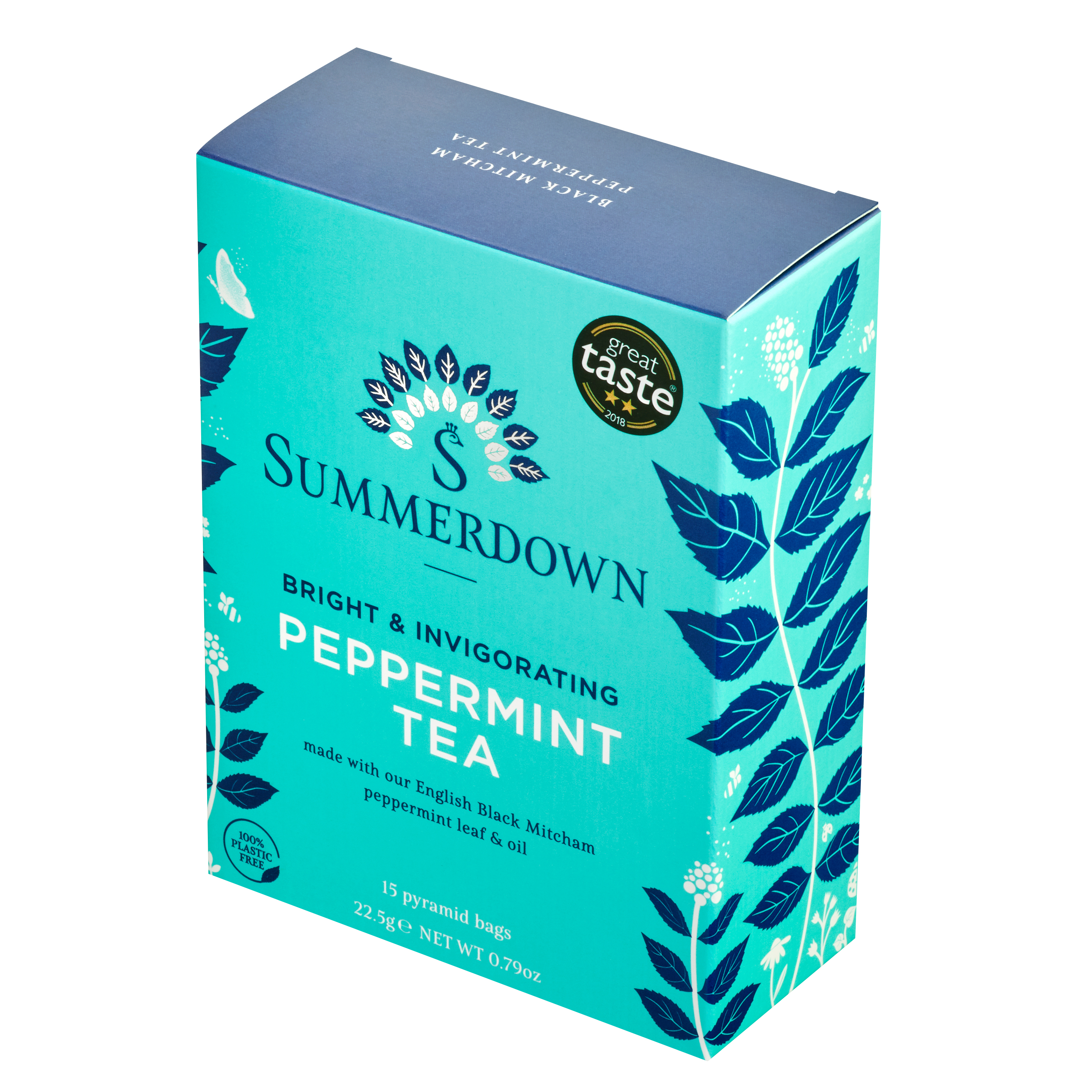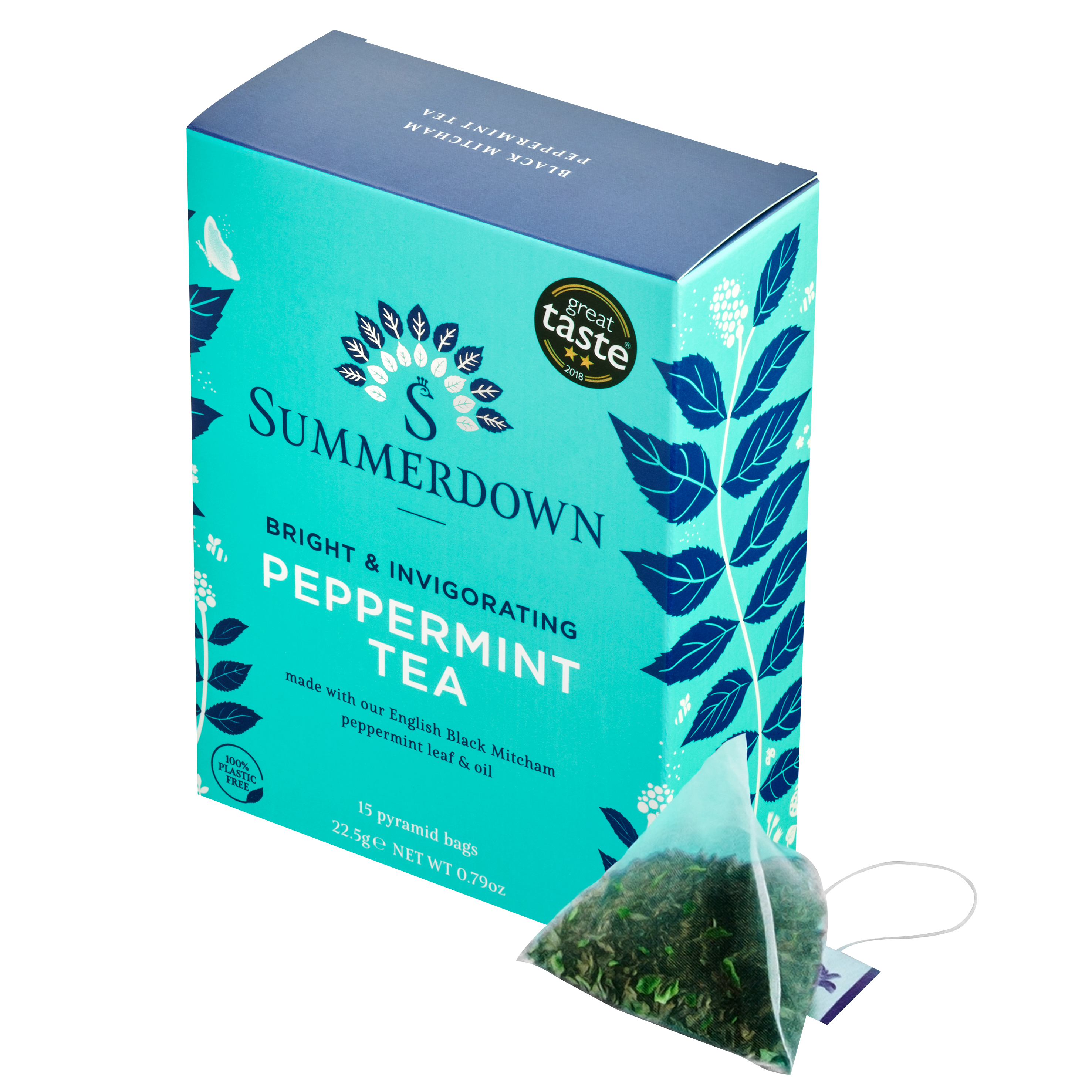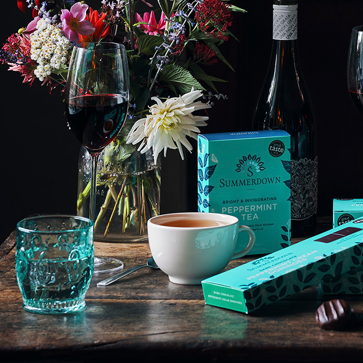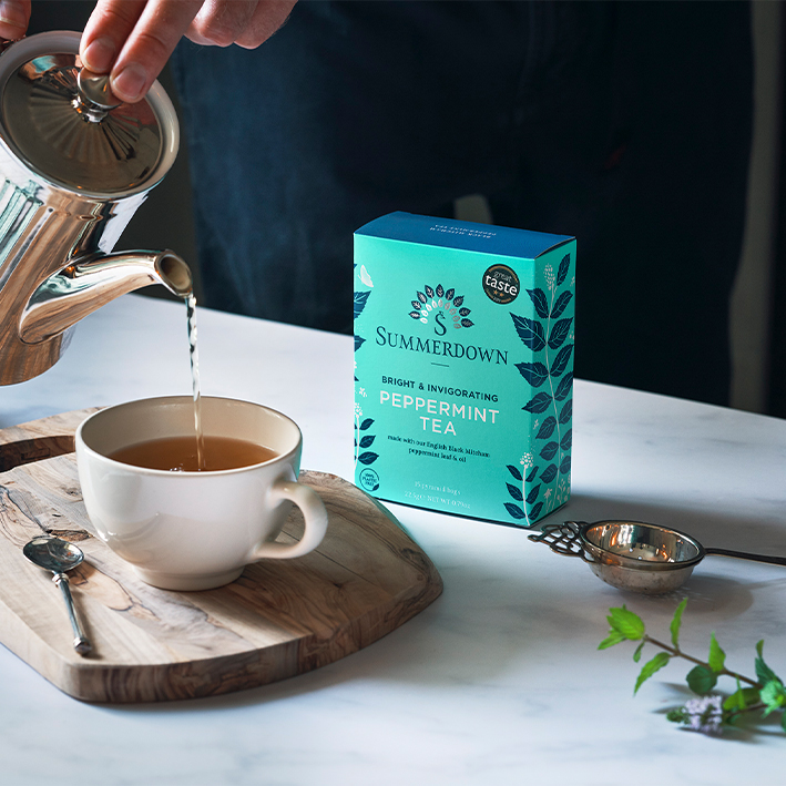 Pfefferminztee aus der englischen Summerdownfarm. Die grob geschnittenen Minzblätter der Sorte "Black Mitcham" entfalten in Pyramidenbeuteln ihr volles Aroma, das mit maritimen Meersalznoten perfekt abgerundet wird.