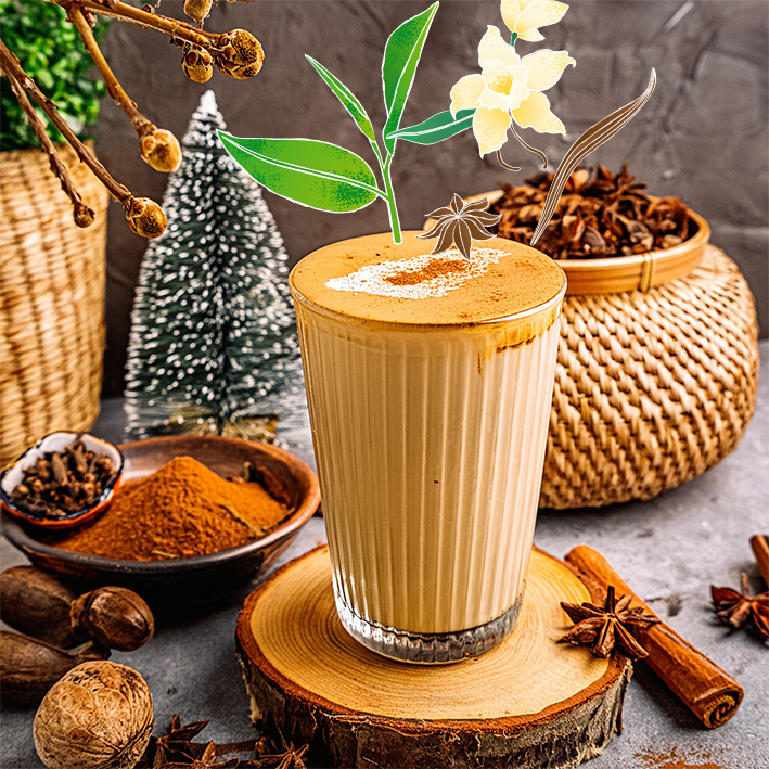 Zucker, Maltodextrin, raffiniertes Kokosnussöl, vollständig gehärtetes Kokosnussfett, Glukosesirup, Kartoffelstärke, Grünteeextrakt 2,5 %, natürliche Aromen, Schwarzteeextrakt 1,5 %, Gewürze 1,6 % (Zimt, Kardamom, Nelke, Ingwer, Piment), Salz, Erbsenprotein, Säuerungsmittel: Citronensäure, Emulgator: Mono- und Diacetylweinsäureester von Mono- und Diglyceriden von Speisefettsäuren, Stabilisator: Kaliumphosphat.